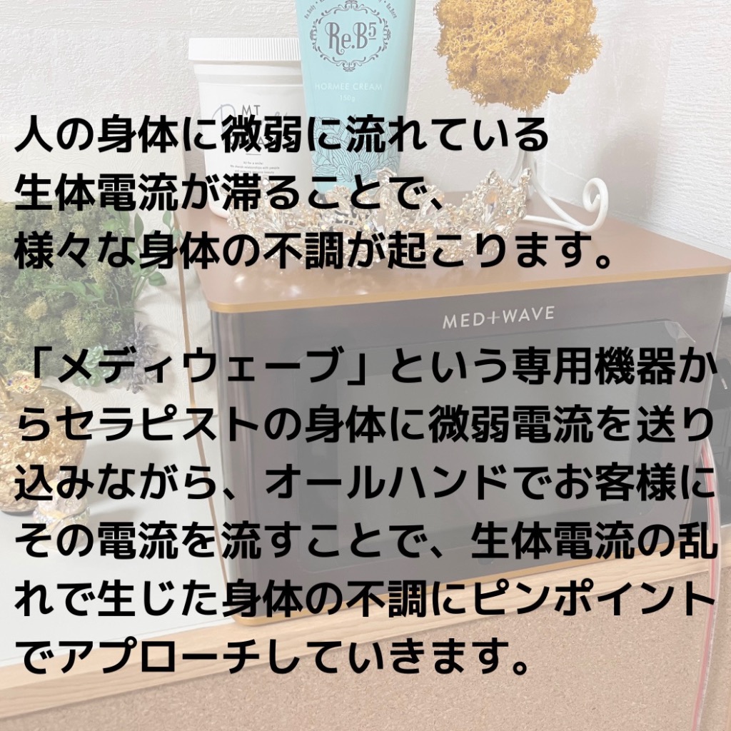 メディセラピー専用機器からセラピストの身体に微弱電流を送り込みながら、オールハンドでお客様にその電流を流すことで、生体電流の乱れで生じた身体の不調にピンポイントでアプローチしていきます。自律神経のバランスを整え、不調を改善することで基礎代謝・基礎体温を上げ、肩こり首こりや腰痛が和らぎ、疲れがとれます。そして、ムダな脂肪を自然と落とせる身体作りを目指していきます。そして身体の内側から生み出される本質的な健康と美をもたらします。