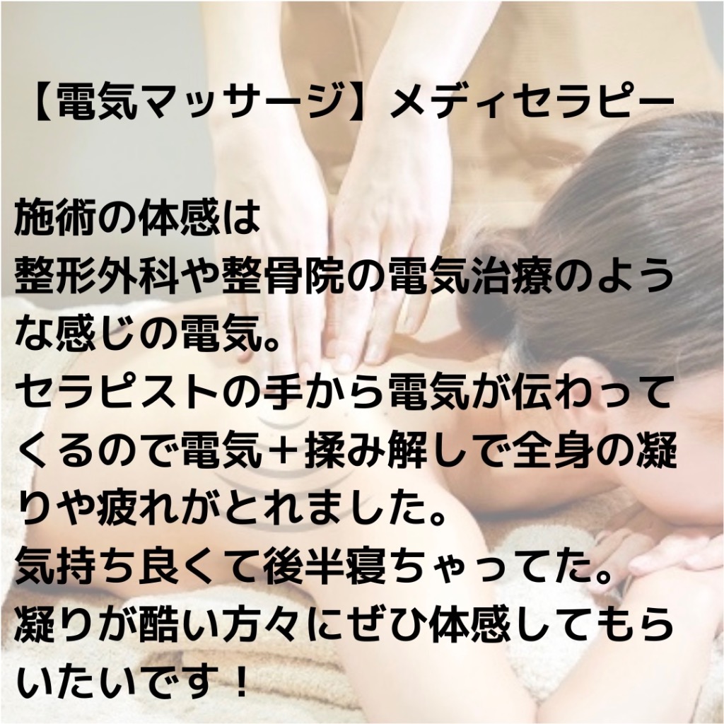 セラピストの手から電気が伝わってくるので電気+揉み解しで全身の凝りや疲れがとれました。