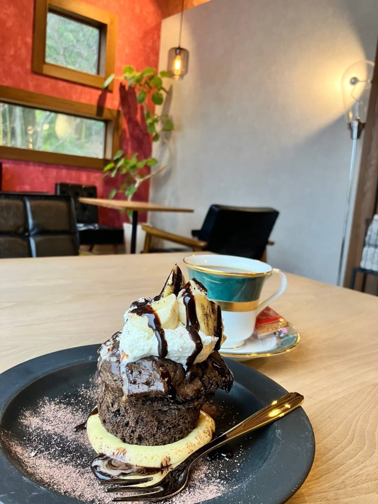 いつもはチーズケーキ頼むんですが、今回はガトーショコラの気分で〜、頼んだら売り切れてて、オーナーさんオススメのチョコバナナカップケーキにしたら!!